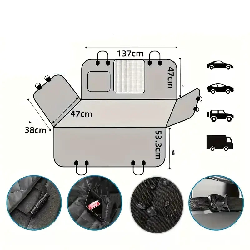 Universelle et adaptée à la plupart des véhicules, elle s’installe facilement grâce à des attaches réglables qui se fixent autour des appui-têtes. Sa surface antidérapante aide à maintenir le chien stable durant le trajet, tandis que son revêtement imperméable permet un nettoyage rapide après utilisation.